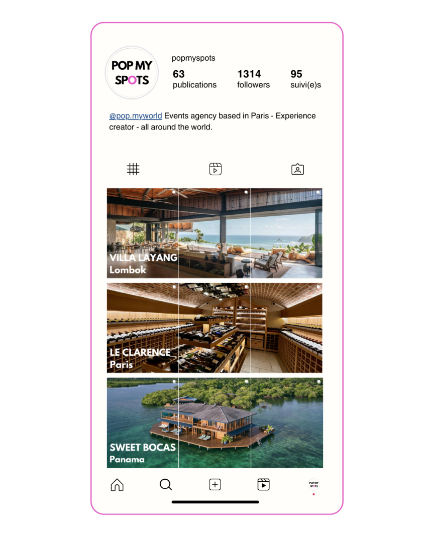 C’est pourquoi nous avons lancé POP MY SPOTS, un compte Instagram dédié à la découverte de lieux d’exception en France et à l’international. À travers cette plateforme, notre équipe partage ses inspirations et ses recommandations pour découvrir des adresses uniques : hôtels de charme, restaurants remarquables, lieux confidentiels ou spots parfaits pour un séjour, une dégustation ou un moment hors du temps.