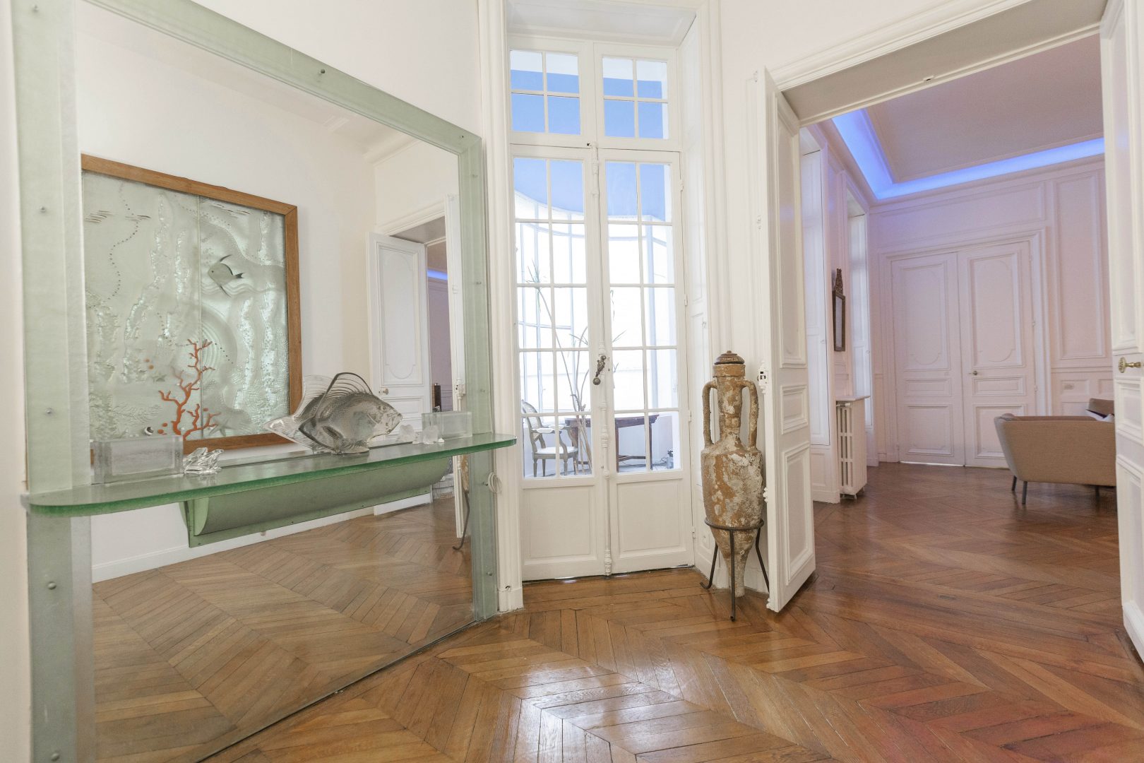 Il est très lumineux grâce à une magnifique verrière, des murs blancs et un superbe parquet ancien. Décoré avec sobriété. On peut y découvrir des uvres d’arts dans chaque pièce.