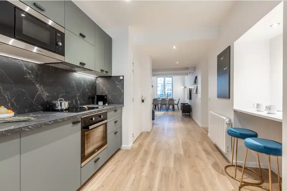 - Une cuisine entièrement équipée invite à la préparation de repas gastronomiques dans un cadre agréable, parfait pour les amateurs de cuisine qui souhaitent profiter du confort d’un chez-soi parisien.