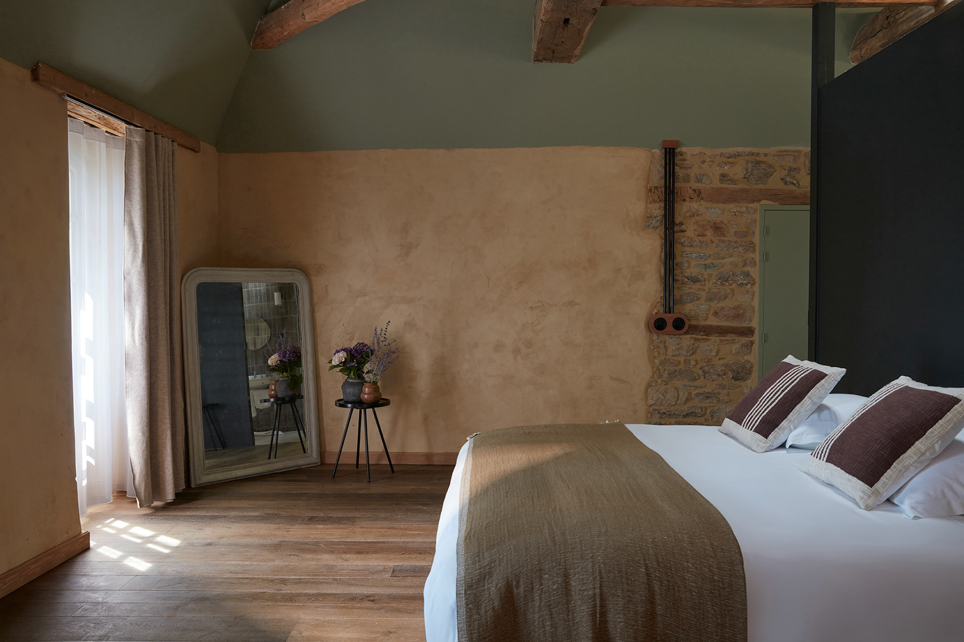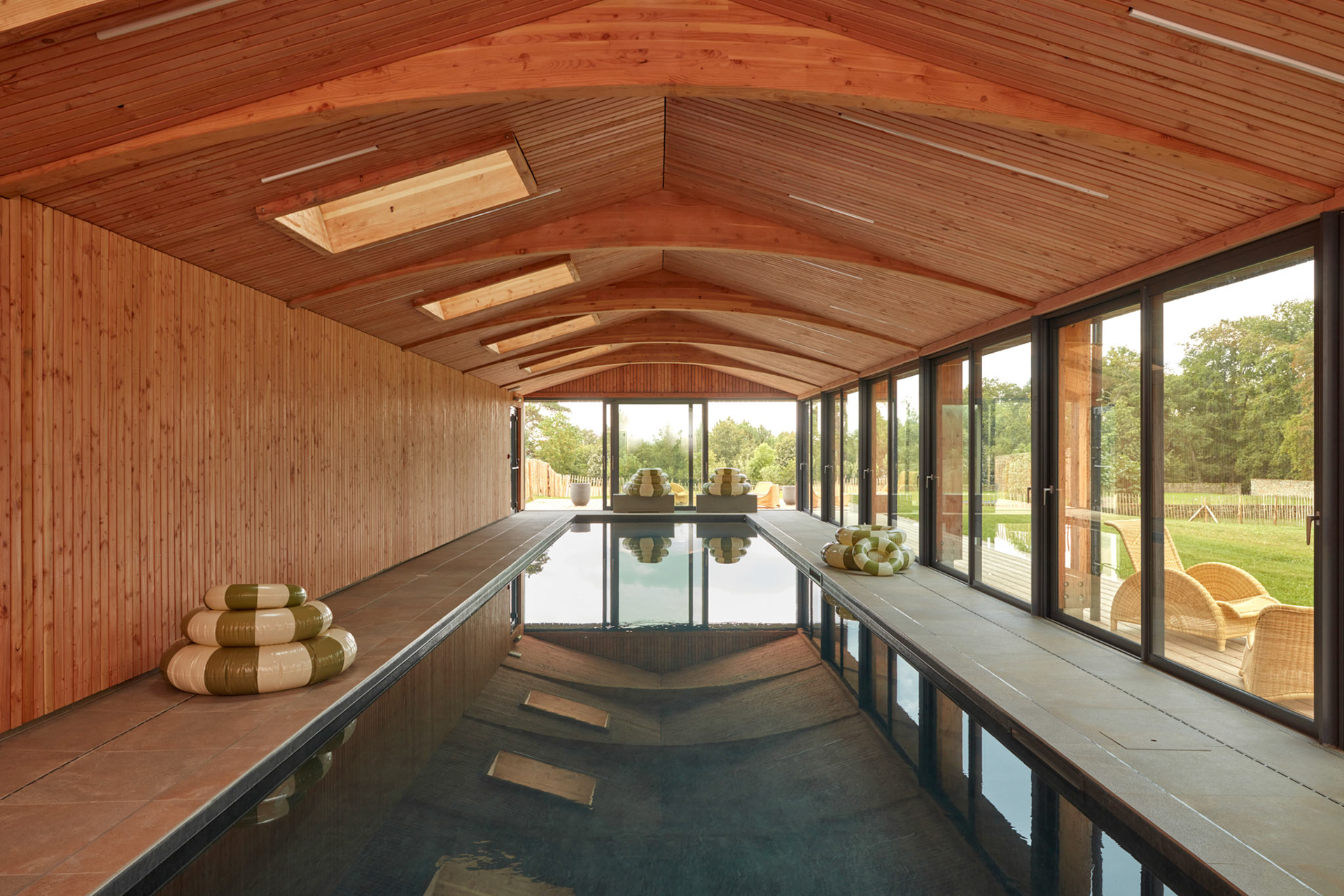 Pour le séjour, six chambres privatives, dont deux suites, créent une ambiance cosy et raffinée. Les espaces communs—deux salons, une cuisine équipée et une salle à manger—invitent à la convivialité. De plus, des hamacs installés dans les combles offrent une vue imprenable sur le parc pour se détendre ou lire.