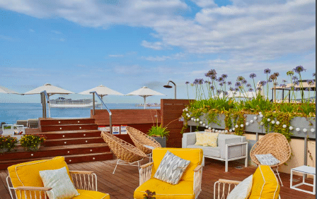 Un rooftop avec vue panoramique sur la mer, idéal pour vos réceptions, pouvant recevoir jusqu’à 100 invités en format cocktail et 60 en banquet.