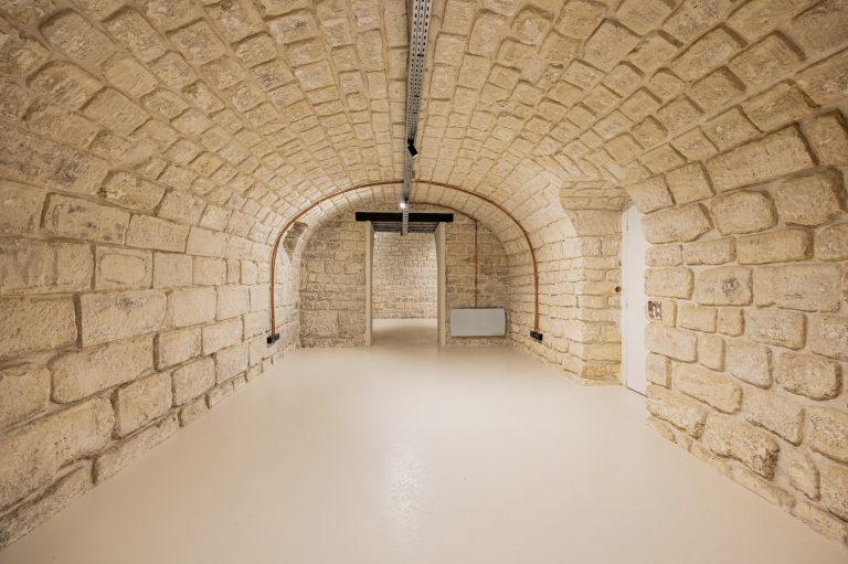 Au sous-sol, les voûtes en pierre naturelle et les lignes courbes instaurent une ambiance feutrée. Cet espace se prête parfaitement à des expériences immersives, des backstages ou des espaces lounge. À l’étage, baigné de lumière grâce à une verrière zénithale, s’étend un volume épuré aux murs clairs, idéal pour des prises de vue, des ateliers ou des présentations privées.