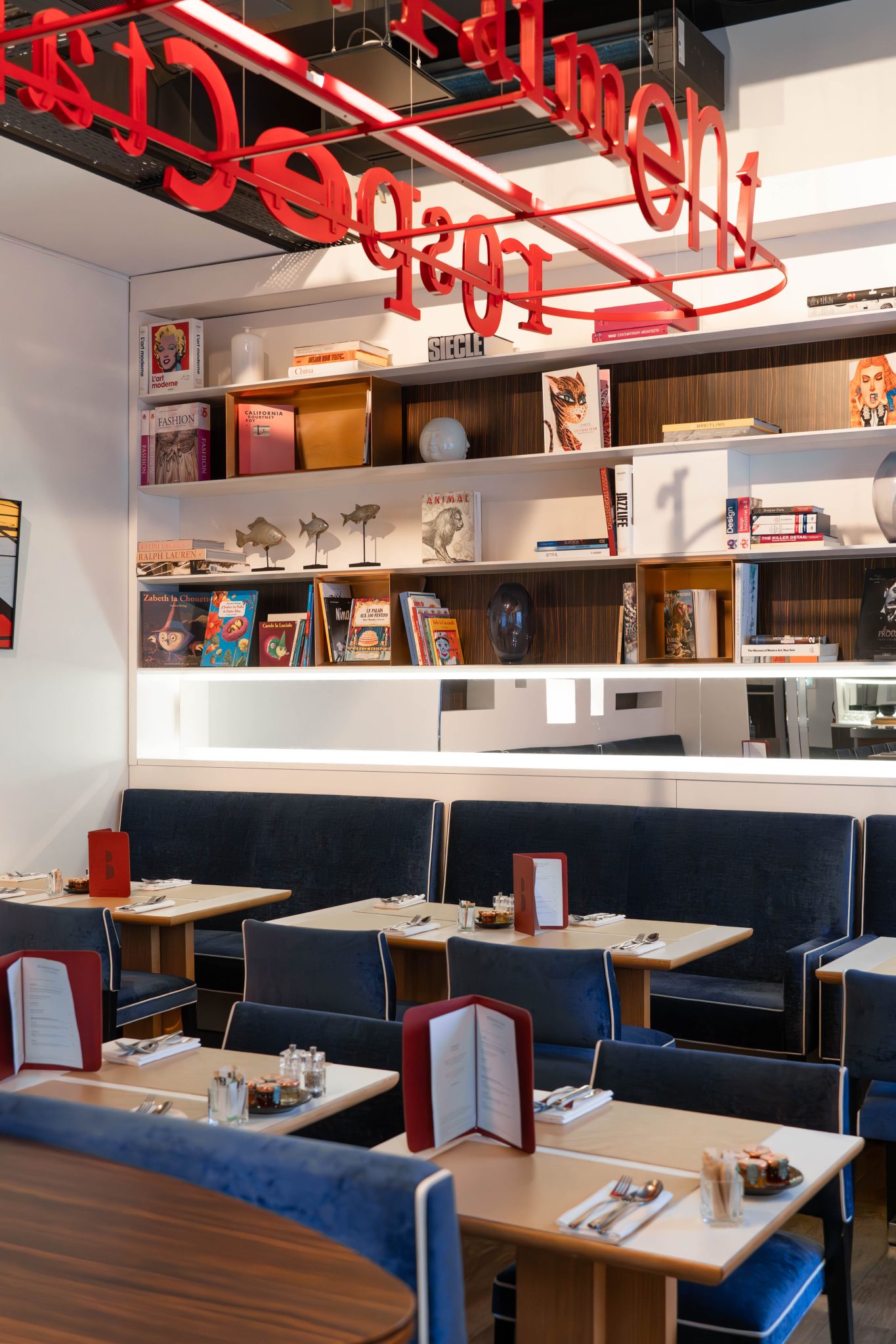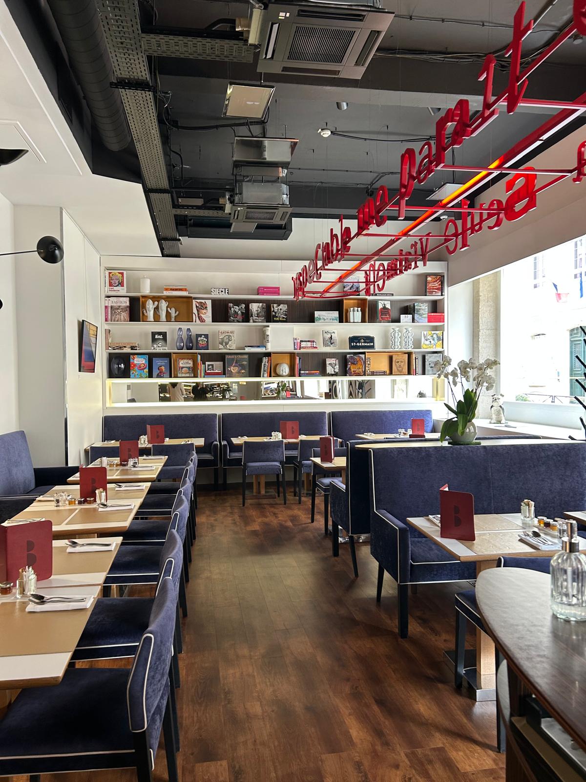 Une bibliothèque riche en livres d’art renforce l’identité culturelle du lieu, tandis que des écrans au plafond diffusent des images de la vie parisienne.