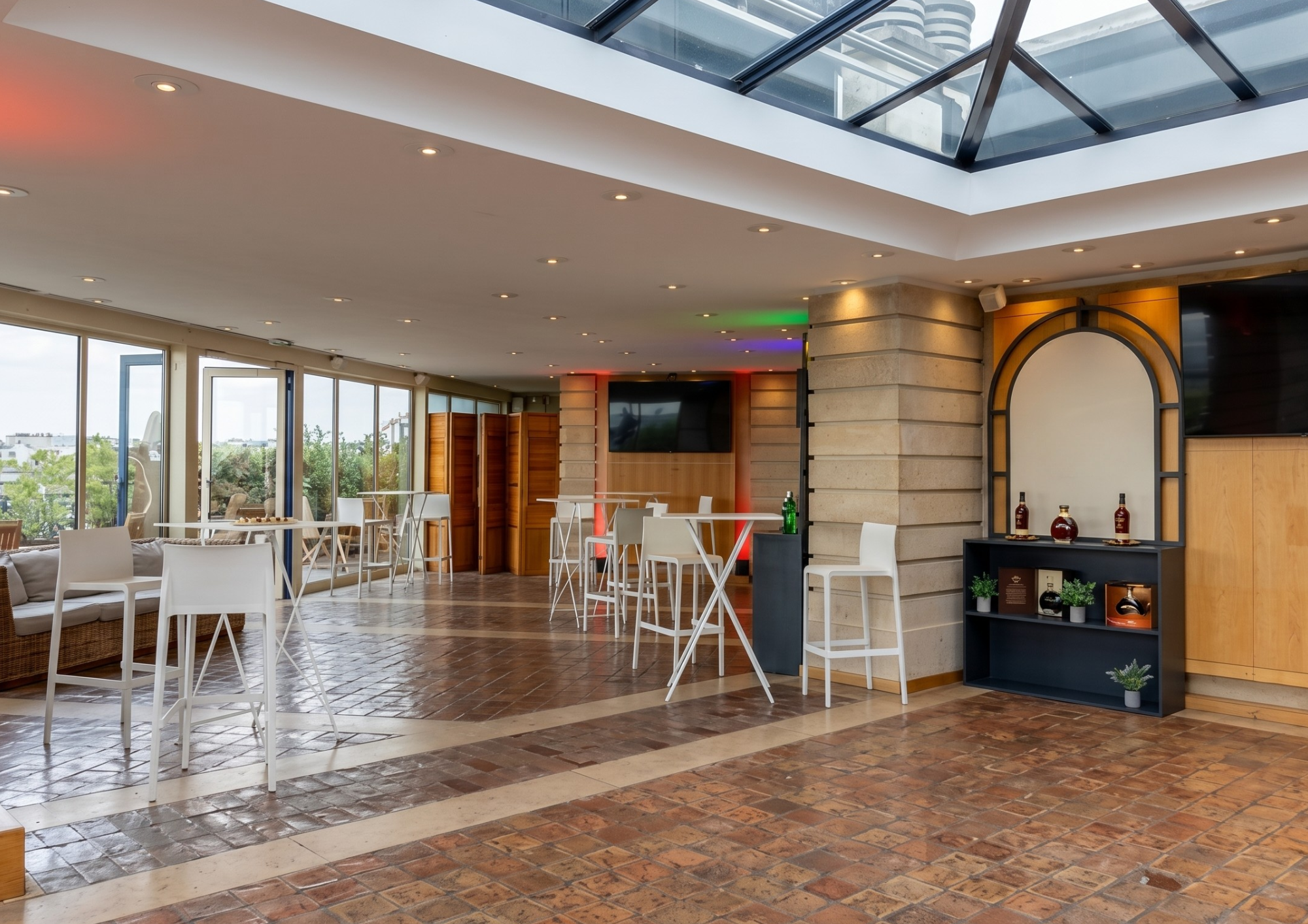 La salle principale de 100 m², baignée de lumière naturelle, est entièrement modulable pour s’adapter à vos besoins : cocktails dinatoires, soirées dansantes, expositions ou ateliers.