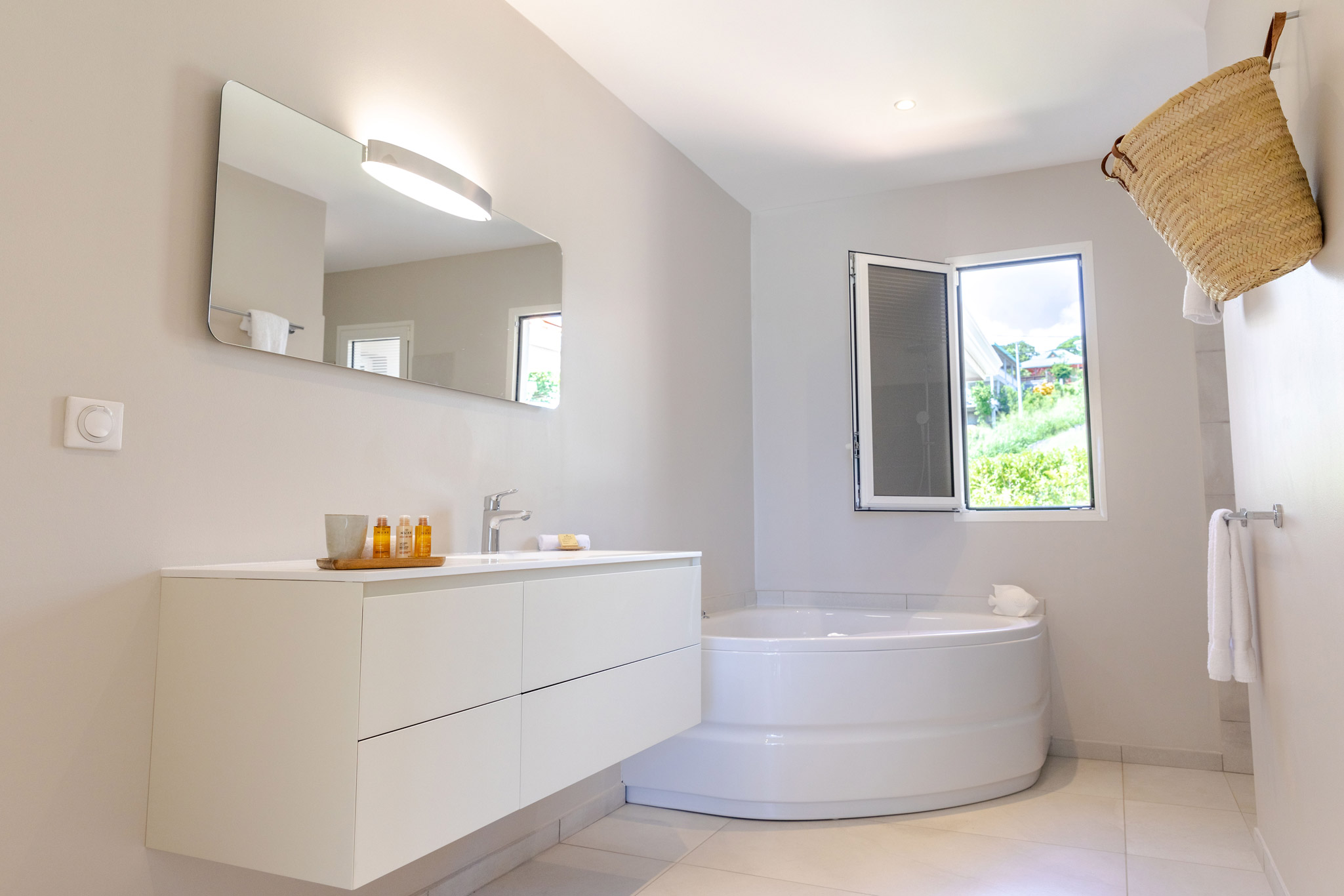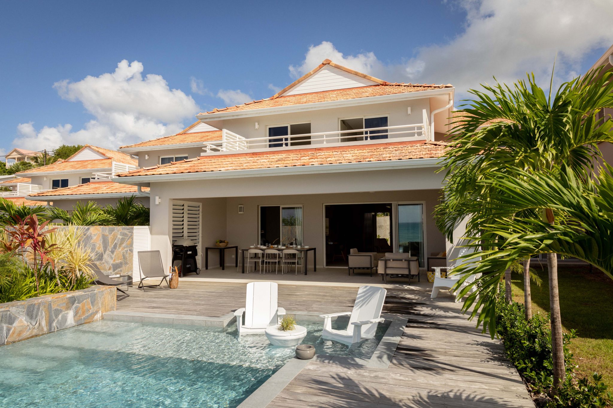 La cuisine américaine, moderne et entièrement équipée, s’ouvre sur un salon climatisé avec TV connectée (55 pouces). À l’extérieur, vous profiterez d’une terrasse spacieuse, d’une piscine à débordement, d’un espace barbecue, d’un salon extérieur et de chaises longues entourées de plantes tropicales luxuriantes. Un parking sécurisé, un système d’alarme et un coffre-fort complètent les équipements pour un séjour en toute tranquillité.