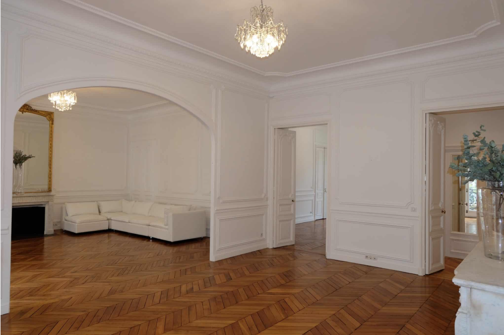 Ce qui rend l’appartement ISABEAU véritablement exceptionnel, ce sont ses éléments architecturaux d’époque. Le parquet en point de Hongrie, typique du style haussmannien, et les moulures originales ont été soigneusement préservés, ajoutant une touche de raffinement et d’élégance à l’espace. Chaque détail, de la cheminée en marbre aux moulures sculptées, participe à créer une ambiance chaleureuse et sophistiquée, propice aux événements de prestige.