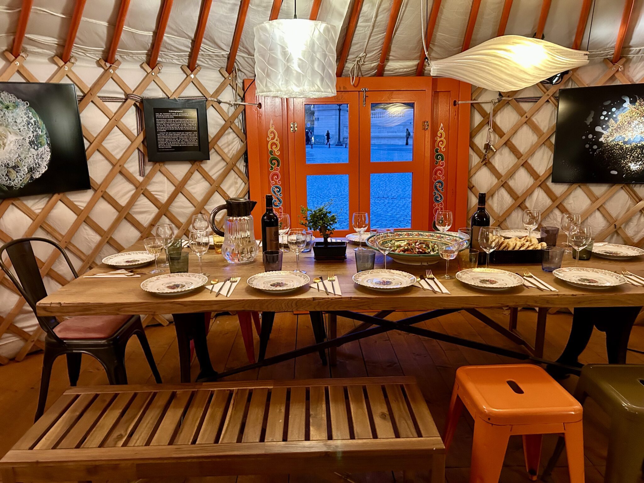 À l’issue de la visite, l’expérience s’est prolongée dans un cadre insolite : un dîner dans une yourte. Cet espace chaleureux a offert une atmosphère conviviale propice aux échanges culturels. La dégustation du champagne Vaucelle a marqué ce moment par une note raffinée, alliant terroir et savoir-faire champenois. Une parenthèse gustative en résonance avec la richesse visuelle et intellectuelle de la biennale.